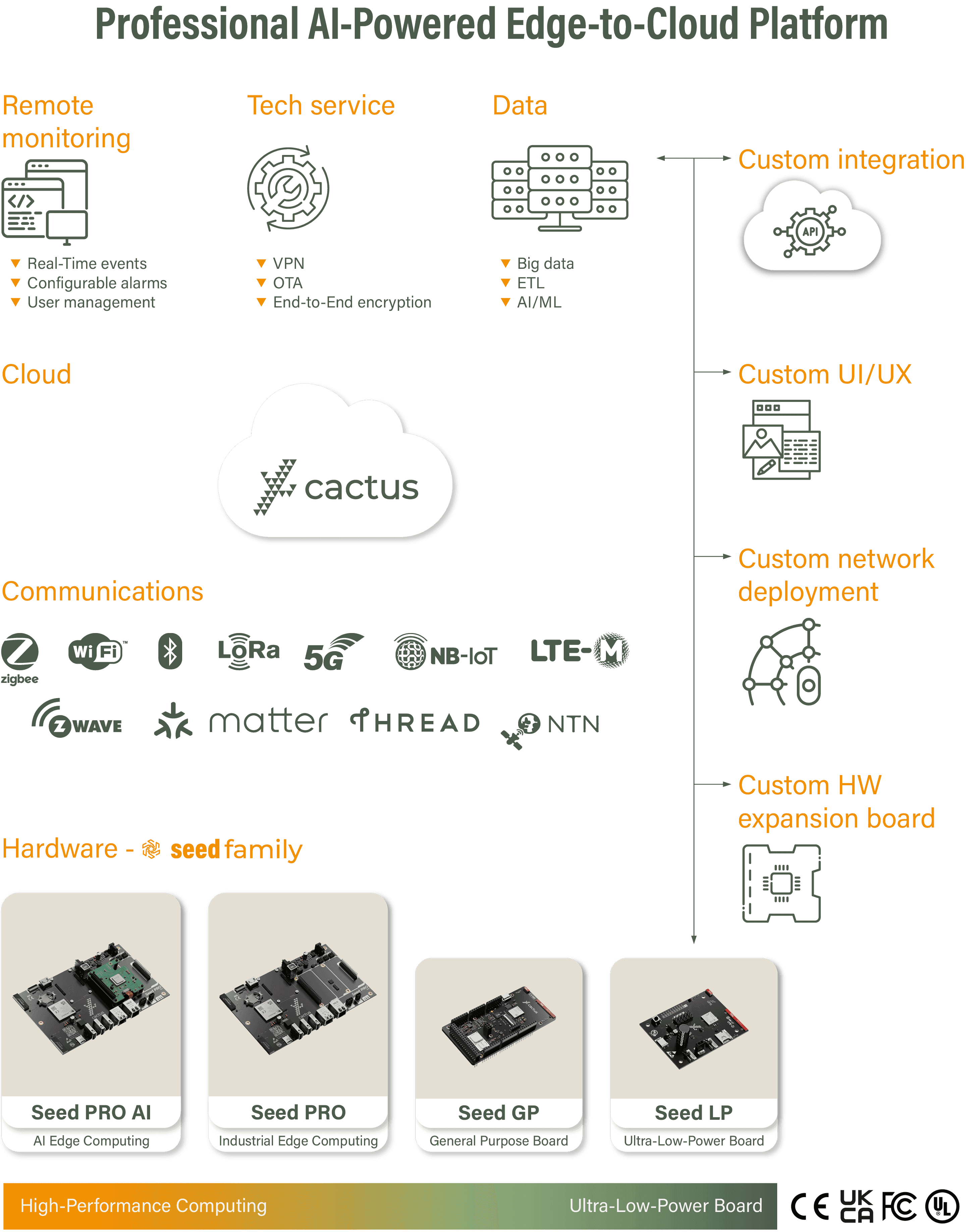 Cactus link is an innovative edge-to-cloud IoT platform designed for professional applications, seamlessly connecting IoT devices with cloud systems. With its modular architecture, it offers unparalleled flexibility, enabling users to customize and scale solutions across industries like smart cities, healthcare, and energy management in homes and buildings, all while ensuring top-tier security, real-time data processing, and CE-certified reliability.